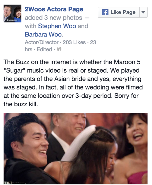 —The most damning bit of evidence: the parents of the Asian couple featured in the video are, in reality, an acting husband-wife duo known as the 2Woos; they actually came forth on their Facebook page and admitted that the wedding they were featured in was a fake. The original post (via screen captures) read: “We played the parents of the Asian bride and yes, everything was staged. In fact, all of the wedding [was] filmed at the same location over a three day period. Sorry for the buzz kill.” The post has since been deleted and replaced with a generic “who really cares if it is real or not … it’s a great music video and we are proud to have been a part of it.”