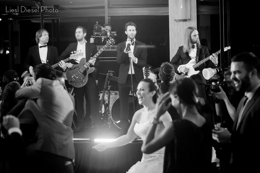 Duke Khodaverdian of Duke Photography in Los Angeles also photographed a different wedding (on the same weekend) that Maroon 5 did “crash.” He described to BridalGuide.com a similar experience that Liesl had at the wedding she worked, saying that “it was a surprise of a lifetime for the couple and for their wedding guests, one that no one will ever forget.” Featured on Duke Photography’s website and Facebook page, images they captured of the day show a comparable type of encounter: the band playing while the video is shot as guests dance, capped by an acoustic performance and thank-you hugs.